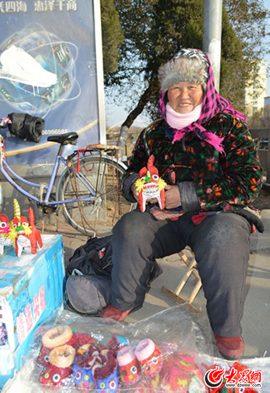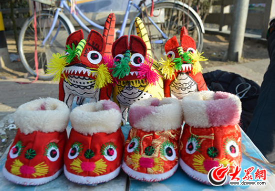 老人親手縫制的布老虎和虎頭鞋。現(xiàn)在會(huì)這種手藝活兒的人越來越少,我們也只能在過年這幾天看到她在中山北路“推銷”作品。