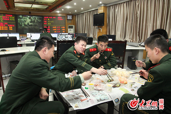 淄博市公安消防支隊(duì)指揮中心官兵們的年夜飯,報(bào)紙配小桌也能吃得和樂(lè)融融。(大眾網(wǎng)記者 仇晶 攝)