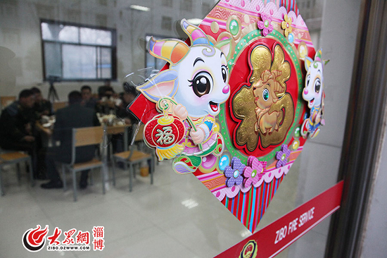 17點(diǎn)整,一聲電鈴響徹大院,今天執(zhí)勤保衛(wèi)城區(qū)平安的特勤中隊(duì)?wèi)?zhàn)士們喊著整齊的口號(hào)列隊(duì)走進(jìn)食堂。淄博市公安消防支隊(duì)黨委書(shū)記、代政委崔連勝也到食堂與全體消防戰(zhàn)士一起吃年夜飯。