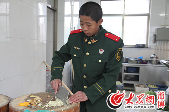 小戰(zhàn)士用嫻熟的刀法為大家準(zhǔn)備年夜飯。(大眾網(wǎng)記者 仇晶 攝)