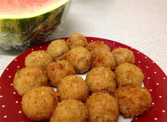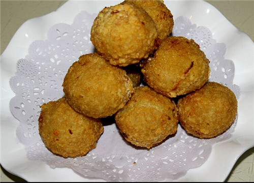 5、梨丸子成型制作:拌料、做餅、包餡、沾粒、炸制。