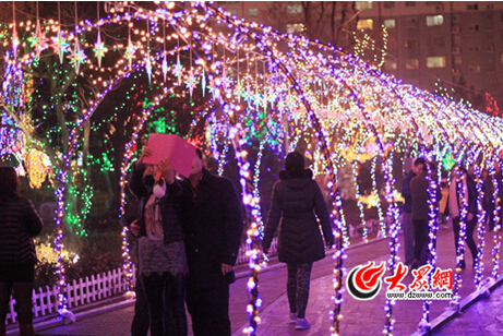 廣場西側(cè)是繁星點(diǎn)點(diǎn)的“星光大道”。五彩的小燈泡纏繞形成的通道十分夢(mèng)幻。人們漫步其中,仿佛置身幻境。