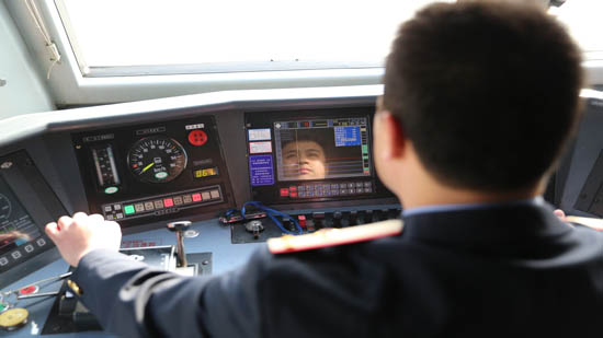 幾分鐘后,記者跟隨孫帥和學習司機康瀛琦來到了機車司機室。孫帥對記者說“徹底瞭望,確認信號,準確呼喚,手比眼看",在整個駕駛過程中,我們兩人需要不斷的重復著這些動作和指令。腳下還有防止司機盹睡的"無人警惕"踏板。”要做一名火車司機,先要從學習副司機做起,跟車熟悉一年左右,通過考試才能晉升學習副司機,然后再經過一兩年,通過鐵道部理論,機車檢查,列車平穩操縱考試才能升為火車司機。”