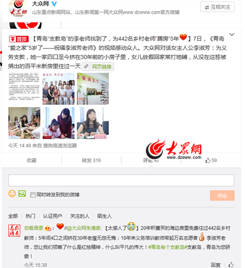 大眾網濟南8月11日訊記者 盛堃)“平凡的偉大,感動中!”“為李淑芳老師點贊!”11日下午,大眾網報道“青島支教島的李淑芳,為442名鄉村老師騰房5年”一事后,受到眾多網友關注。在短短半天的時間里,網友紛紛在山東24小時客戶端、微博、微信等平臺為李淑芳和“支教島”點贊,文章轉發、評論已達數萬次。今天,“支教島”刷爆了網友的朋友圈,“微傳播”的凡人善舉感動了萬千網友。