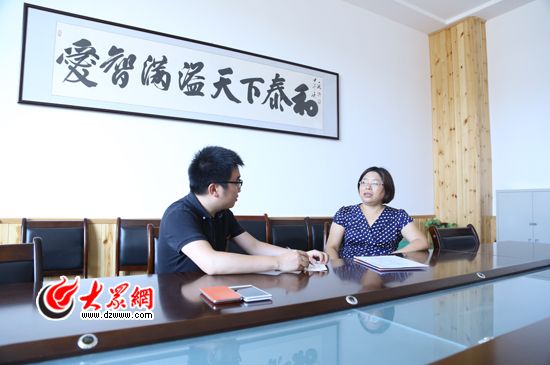 “支教島”校長(zhǎng)聯(lián)盟成員、青島天泰城學(xué)校校長(zhǎng)王建娥(右)向大眾網(wǎng)記者講述她與“支教島”的不解之緣。(亓翔 攝)