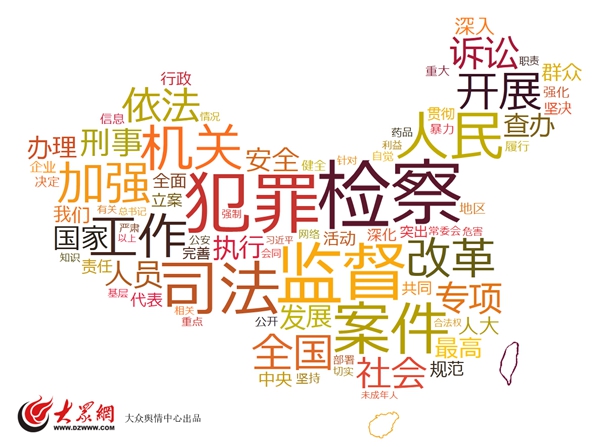 1月26日下午,山東省十二屆人大五次會議在山東會堂舉行第二次全體會議,山東省高級人民法院院長白泉民向大會作山東省高級人民法院工作報告。大眾輿情中心利用大數據詞云,對法院工作報告進行數據解析,“案件”一詞被提及56次,出現頻率最高。[詳細]