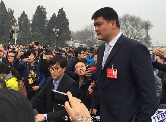 大眾網北京3月3日訊(特派記者 王磊)“去年提案受表揚,今年有沒有新提案?”“準備生二孩嗎?”……今天下午,在人民大會堂東側廣場,全國政協委員姚明的出現迅速吸引大批記者追逐,面對各種提問,姚明一直一言未發,大步走進會場。