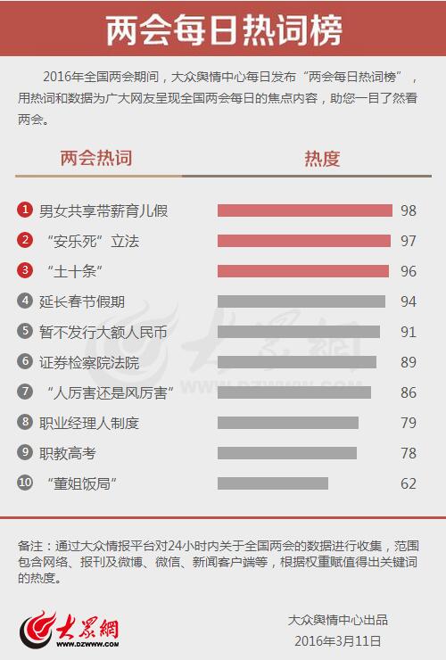 大眾網(wǎng)3月11日訊(記者 劉欣 劉洪 宋瑋瑋)今天,大眾輿情中心發(fā)布第十期“兩會(huì)每日熱詞榜”。今日上榜的熱詞涉及假期、環(huán)保、立法、養(yǎng)老等多個(gè)話題,“男女共享帶薪育兒假”“‘安樂(lè)死’立法”“土十條”分別以98、97和96的熱度成為今日最熱詞。