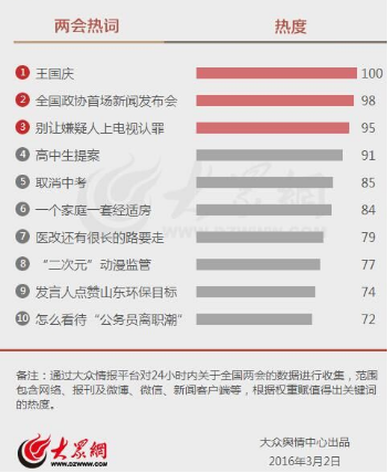 今天,大眾輿情中心發布第一期“兩會每日熱詞榜”。“王國慶”“全國政協首場新聞發布會”“別讓嫌疑人上電視認罪”分別以100、98和95的熱度進入熱詞榜前三名。