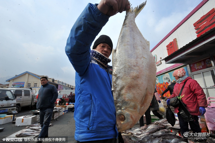 2016年01月18日,青島王哥莊港東村村民劉元寧,帶著自家制作的干魚趕臘月年集。