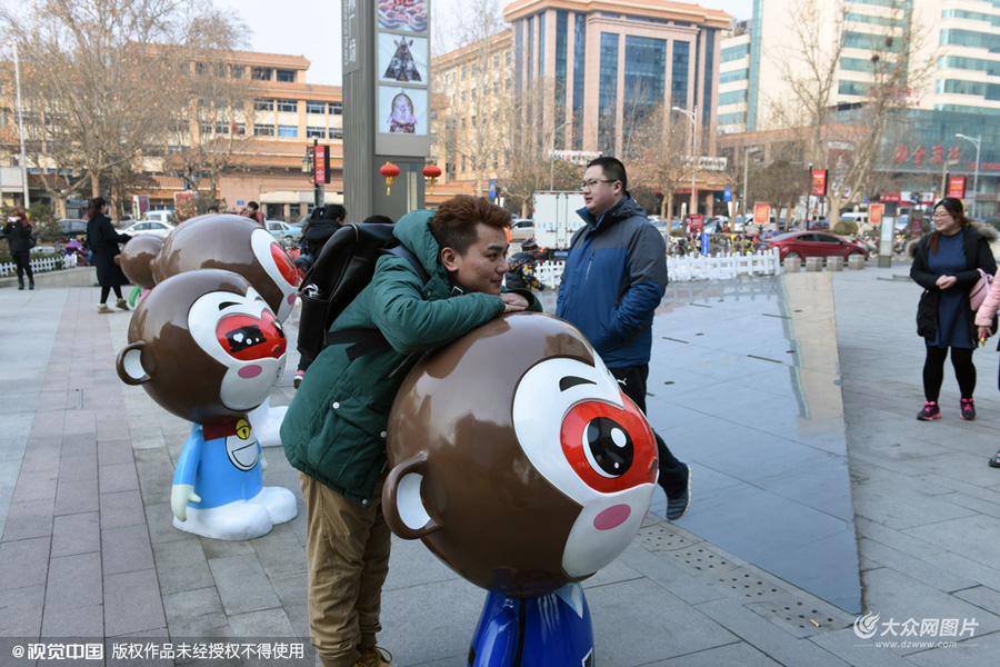 2014年01月29日,山東省濟南市,1月29日,濟南泉城路世茂廣場門前,72只孫悟空卡通形象集體亮相,七十二變鬧新春,成為街頭一道風景線,市民游客紛紛駐足合影留念。圖片作者:豆芽菜/視覺中國