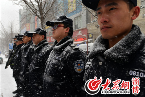 淄川公安分局服裝城派出所民警帶領(lǐng)協(xié)勤人員冒雪在轄區(qū)內(nèi)巡邏值守,確保不發(fā)生任何問題(王新明攝)