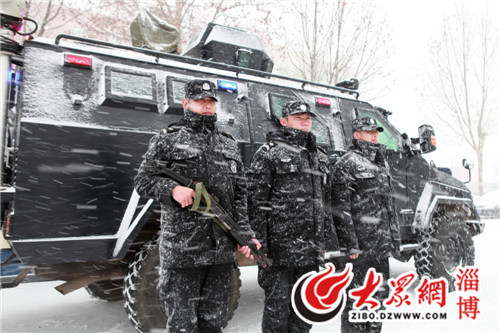 淄川公安分局特勤中隊隊員冒雪在淄川長途汽車站、公交車站等重點部位巡邏值守(王新明攝)