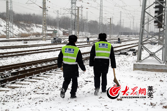 大眾網萊蕪1月23日訊(記者 亓秀寶)22日,萊蕪市寒潮“冬道主”迅猛到來,自早8點半左右開始自北向南給萊蕪披上了一層“棉被”,寒潮的到來對萊蕪各行各業都產生了很大的影響,鐵路部門對降雪更是不敢小覷,鐵路公安的民警也加入到了清雪的行列中,清岔口、巡線、指揮道口交通,坐不住的他們全天候行走在鐵路一線。