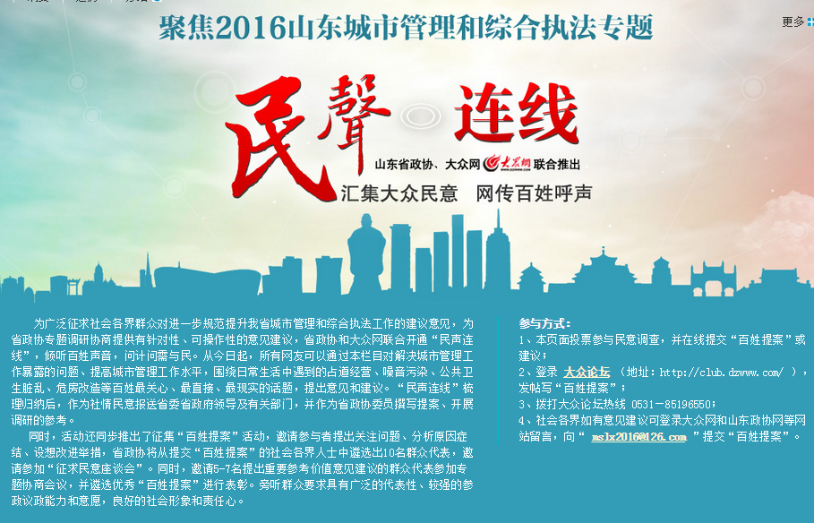 本次省政協(xié)“民聲連線”活動的征集時間為3月10日至5月20日,除在大眾網(wǎng)等媒體網(wǎng)絡(luò)平臺推出大型民意調(diào)查 外,還推出征集“百姓提案”活動,歡迎廣大群眾圍繞城市管理和綜合執(zhí)法提出關(guān)注問題、分析原因癥結(jié)、設(shè)想改進(jìn)舉措。您身邊有亂倒生活和工業(yè)垃圾、違章占道 擺攤的現(xiàn)象嗎?您關(guān)心危舊房屋的整改拆除、外來人口的醫(yī)療教育及管理問題嗎?您目前所在城市的管理效果如何,存在哪些突出問題?您對于城市管理執(zhí)法隊(duì)伍的 評價如何,有啥好點(diǎn)子好想法嗎?歡迎登陸大眾網(wǎng)相關(guān)專題(http://guocaisb.com/2016/jj2016/)、省政協(xié)網(wǎng)站、聯(lián)合網(wǎng)等 網(wǎng)絡(luò)平臺投票留言,在線提交“百姓提案”。您還可以關(guān)注“山東政協(xié)”微信公眾號后在“民聲連線”欄目提交建議,或發(fā)送郵件至 minshenglianxian@163.com,提出您對規(guī)范城市管理和綜合執(zhí)法工作的建議、期待。