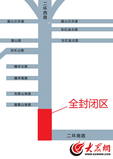 具體繞行路線為:經(jīng)二環(huán)南路至二環(huán)西路的車輛建議繞行103省道至濟南南繞城高速,或至104國道黨楊路繞行;北向南車輛從二環(huán)北路至二環(huán)西路的車輛建議繞行濟南西繞城高速到104國道,或者沿經(jīng)十路、黨楊路至104國道通行;西向南車輛,可以從濟南西收費站至104國道或二環(huán)南路,或者從經(jīng)十西路、黨楊路至104國道或二環(huán)南路;南向北車輛,可以繞行固山收費站至經(jīng)十西路、二環(huán)西路,或者從104國道、黨楊路至劉長山路延長線、二環(huán)西路。