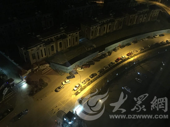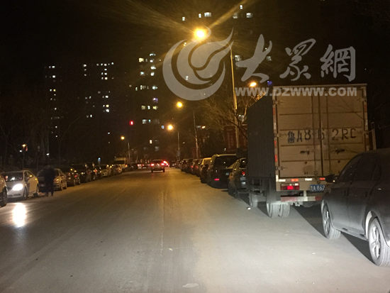 我們在晚上的時間,在路邊很多小區周邊的馬路上,拍了一些停車的圖片。這是在領秀城里邊,這一張是在濼源大街,有兩輛車是違法停車,一個停在輔道上,一個停在人行道上。這個是大概11月左右,在家樂福過街天橋上拍,雙向BRT車道上看不到一輛車,但兩側的行車道上行駛非常緩慢。