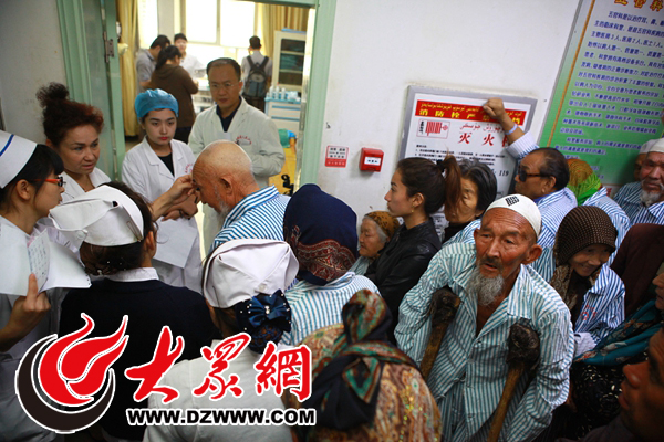 “喀什光明行”活動(dòng)經(jīng)過(guò)前期幾個(gè)月的籌備工作,8月30日如期走進(jìn)第一站麥蓋提縣人民醫(yī)院。當(dāng)天,天空中下著小雨,氣溫有些低,當(dāng)以山東大學(xué)第二醫(yī)院眼科主任張晗為核心的專(zhuān)家團(tuán)隊(duì)來(lái)到眼科門(mén)診的時(shí)候,走廊里站滿了人,門(mén)外的白內(nèi)障患者和家屬們滿臉焦急,早已排隊(duì)等候著專(zhuān)家做術(shù)前檢查和手術(shù)。專(zhuān)家團(tuán)隊(duì)稍做準(zhǔn)備后,立即進(jìn)入工作狀態(tài)。人群一側(cè),一位身穿病號(hào)服的老奶奶引起了記者的注意,老人貼墻而站,沒(méi)有任何人陪伴,和人群保持了一定距離,和旁邊被左右家屬攙扶的白內(nèi)障老人們比起來(lái)顯得尤為孤獨(dú)。記者好奇的走了過(guò)去,因?yàn)檎Z(yǔ)言不通,所以需要憑借醫(yī)院護(hù)士的翻譯,在簡(jiǎn)單的了解后,老人的遭遇令記者深感同情。圖為白內(nèi)障患者等待著山大二院專(zhuān)家做術(shù)前檢查。王厚江 攝影
