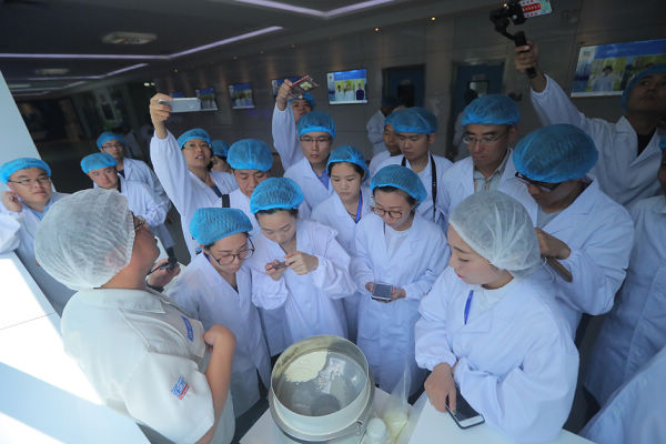 “我們的震動粉篩直徑僅為0.87毫米,別說是木塊了,就連蚊蟲都過不去。”圣元公司總經(jīng)理李克告訴記者。圖為采訪團記者參觀模擬奶粉震動粉篩過程。
