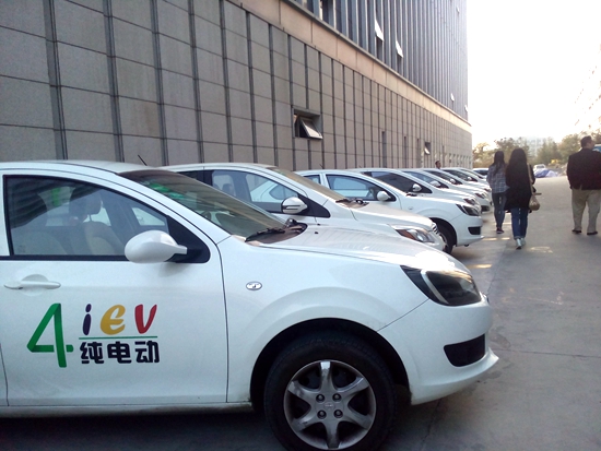 記者們發現,在辦公樓后面,七八輛轎車正通過特來電的“電動汽車群智能充電系統”充電,該系統可實現40臺車同時充電。(記者 王宗陽 攝)