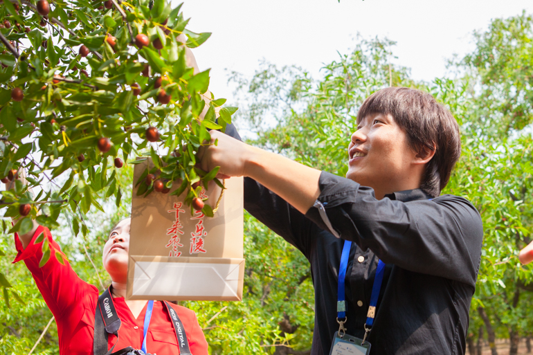 隨手摘下一顆熟透了的紅棗塞進嘴里,記者們立刻被樂陵小棗特有的香甜俘虜,一邊向棗林深處漫步,一邊摘下更多的甜蜜放到舌尖(撒偉 攝)