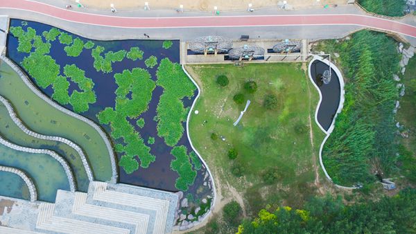 蜿蜒綿長的健身步道,四周郁郁蔥蔥,往東看是一片綠林,北邊睡蓮開的正盛,西邊太陽谷微排大廈氣勢恢宏,南邊幾艘游船泛舟河中(撒偉 攝)