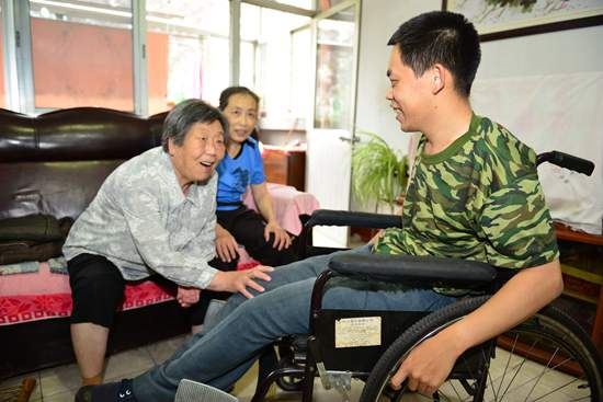 有一次,譚悅華因為腦血管病復發頭暈得厲害,在從醫院打完吊瓶回家的路上,都是扶著墻一步步挪回來的。好不容易開開門,便一下坐到沙發上動彈不得。可就在這時,譚大媽突然扭頭從窗戶上看到了這樣一幕:蘇鐵星正豐努力把改造過的殘疾自行車推到棚廈內,但因腿實在僵硬的厲害,試了好多次都沒有成功,胳膊也因為撞到墻角處而流出了鮮血。譚悅華再也坐不住了,因為頭暈得厲害,她試了幾次都沒從沙發上坐起來,但看到蘇鐵星為難的樣子,她便硬生生的拽著落地扇的架子站了起來,然后扶著墻一步步挪到蘇鐵星面前。這時,譚悅華已經是體力不支,臉上的汗一滴滴的落到蘇鐵星身上,蘇鐵星心疼的對譚悅華說:“譚姥姥,您別管我了,您快回去休息吧,我自己能行的。”但譚悅華硬是強忍著幫蘇鐵星把車推進了棚廈內,又扶著他換了輪椅,把他推回了家,譚悅華回到家里臉色蒼白,躺到床上便再也起不來了。