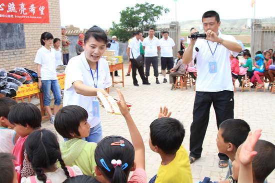 2012年7月28日寧夏支教,張春霞、李強給孩子們發文具