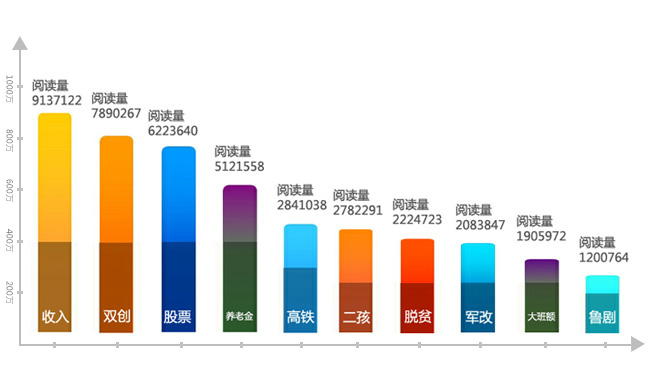 排在熱詞榜后五位的分別是總體閱讀量2782291的“二孩”,總體閱讀量2224723的“脫貧”,總體閱讀量2083847的“軍改”,總體閱讀量1905972的“大班額”,以及總體閱讀量 1200764的“魯劇”。除了百姓永遠關注的民生熱點,政治、文化等也受到青睞,且所有熱詞總體閱讀量均突破了百萬大關。