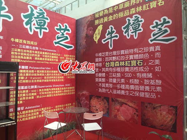 24日,大眾網記者提前探營第六屆山東文博會現場,位于濟南國際會展中心三樓中心位置的臺灣館已經布置得差不多了。25日,濟南市民就能一睹牛樟芝的風采了。據悉,牛樟芝又名牛樟菇,屬于非褶菌目、多孔菌科、薄孔菌屬、多年生蕈菌類,是1990年才被生化界發表的新種。其生長區域為臺灣山區海拔450至2000米山林間,只生長在臺灣特有百年以上的牛樟樹樹干腐朽之心材內壁,或枯死倒伏之牛樟樹木材潮濕表面,因其采集不易,加上野生牛樟木近年已被列為珍稀生物之一,也因此盜采牛樟芝社會事件仍時有所聞。