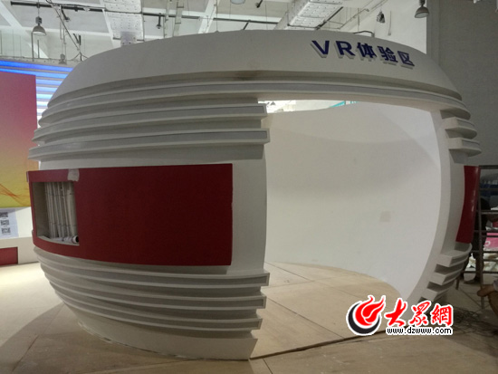 來到位于會展中心一樓的大眾報業(yè)集團(tuán)展館,主體部分以白色為主,線條簡潔流暢。一名正在忙碌的工作人員告訴記者,展館主體部分的造型遠(yuǎn)看如展開的雙翼,又似層層疊疊的臺階,象征著展翅高飛、勇攀高峰的力量。除了對報紙、出版、影視等文化傳媒的介紹,最吸引眼球的當(dāng)屬展館前的一個球形展區(qū)——VR體驗區(qū)。今天下午,大眾網(wǎng)的工作人員已經(jīng)開始在這里安置各種“神秘”設(shè)備,明天一早文博會開展后,大伙兒就可以親自來一次VR體驗啦。
