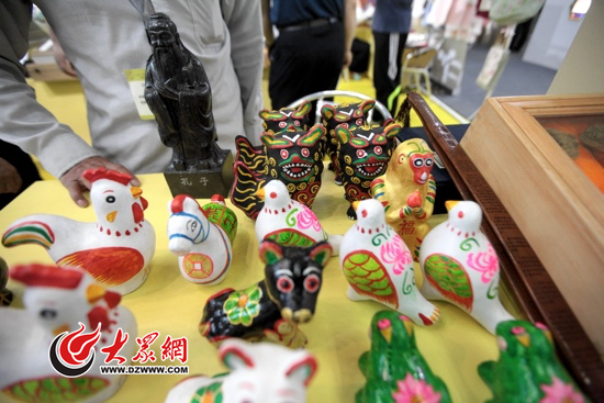 位于2號館的濟寧、威海展區雖然面積小了不少,但是展示亮點和對觀眾的吸引力一點也不遜色。作為孔子誕生地,濟寧將孔子文化特色發揮得淋漓盡致。在展廳入口處,一尊半人高的孔子雕像引人注目,展廳內展示的也多是與儒家文化有關的文化產品,無不透露著深厚的歷史底蘊。濟寧的民間藝人還將非物質文化遺產魯錦技藝、古兵器制作和西田泥咕咕等帶到了現場。