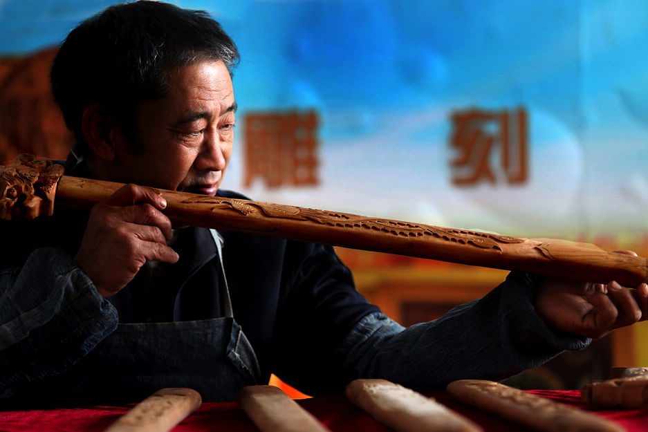 選材、曬干、拼接、打磨、雕刻、上漆……一件精美的桃木雕刻作品要經(jīng)過幾十道繁雜的工序。如今以桃木雕刻為生計的民間匠人日漸稀少,但在墾利縣墾利街道北蒼州村,一位患小兒麻痹癥的村民卻沒有被病魔打倒,幾十年如一日,他始終傳承著桃木雕刻的老技藝,他就是楊敬文。