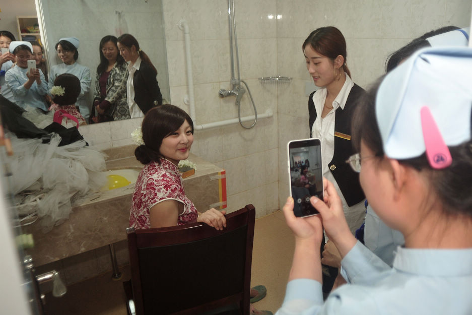 戴上假發、化完妝刁姿靜讓人感到驚艷,護士紛紛拿出手機記錄這美好瞬間。