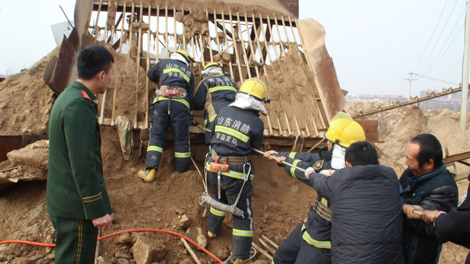 2015年11月29日上午11時(shí),青島市城陽(yáng)區(qū)公安消防大隊(duì)春城路中隊(duì)接到報(bào)警稱,位于城陽(yáng)區(qū)前旺疃社區(qū)附近一沙土場(chǎng)工人被埋,中隊(duì)迅速出動(dòng)一部搶險(xiǎn)救援車,7名官兵趕赴現(xiàn)場(chǎng)。到場(chǎng)后,指揮員發(fā)現(xiàn)工人因操作不當(dāng)被埋壓在篩沙機(jī)的漏斗底部。消防官兵采用液壓擴(kuò)張鉗、開(kāi)縫器、鐵鋌等破拆工具對(duì)漏斗底部進(jìn)行破拆,將設(shè)備內(nèi)的沙土進(jìn)行導(dǎo)流。圖為消防官兵合力將被困人員救出。青島財(cái)經(jīng)日?qǐng)?bào) 作者:劉瑞東 編輯:林紅