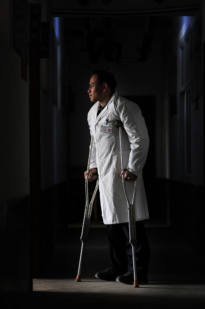 中藥學(xué)、方劑學(xué)、針灸、中醫(yī)婦兒科……大學(xué)的校園里,王強(qiáng)如饑似渴地學(xué)習(xí)著各種專業(yè)知識(shí)。每天,教室里他都是第一個(gè)到、最后一個(gè)離開,有時(shí)他心里想要是每一天的時(shí)間能有36個(gè)小時(shí)、48個(gè)小時(shí)該多好,那樣就可以再多騰出點(diǎn)時(shí)間學(xué)習(xí),就可以距離一名真正的醫(yī)生更近。大三寒假,王強(qiáng)回老家過年。碰巧一個(gè)鄰居扭傷了腰,疼痛不已,吃了很多藥也不管用。王強(qiáng)得知后主動(dòng)為這位鄰居針灸,結(jié)果一次之后癥狀便有改善,針灸兩三次之后便痊愈。鄰居對(duì)王強(qiáng)感謝不已,王強(qiáng)更是感覺到了前所未有的滿足——這是王強(qiáng)第一次為別人治病。2008年大學(xué)畢業(yè)后,由于身體條件的限制,王強(qiáng)就業(yè)屢屢碰壁,幸好這時(shí)兗州市鼓樓醫(yī)院的羅鵬院長(zhǎng)接納了他。在鼓樓醫(yī)院工作的近兩年里,王強(qiáng)把自己的專業(yè)知識(shí)應(yīng)用的臨床上去,并且跟隨在羅院長(zhǎng)身邊,邊工作邊學(xué)習(xí),不斷積累經(jīng)驗(yàn),彌補(bǔ)自己臨床技能的缺陷。更難能可貴的是,羅院長(zhǎng)本人也身有殘疾,可是他卻每天微笑著面對(duì)生活,并且為病人付出了全部的愛心,這種精神深深地震撼著王強(qiáng)。