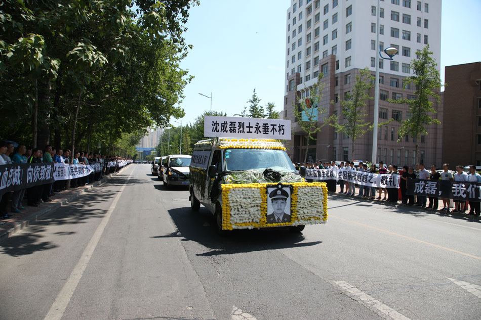 6月19日,英雄沈成磊追悼大會在煙臺市市府禮堂舉行,數千市民自發為他送行。5月27日下午,煙臺市萊山區公安分局刑警中隊長沈成磊與戰友查訪被盜車輛線索,在與犯罪嫌疑人遭遇時遭到拒捕反抗。犯罪嫌疑人持刀將沈成磊刺傷,沈成磊為避免周圍群眾和戰友傷亡,死死揪住嫌疑人不放,被歹徒連刺數刀倒地,嫌疑人趁機逃逸,沈成磊經送醫院搶救無效,壯烈犧牲,年僅36歲。沈成磊的事跡后被央視等重量級主流媒體報道。煙臺晚報 作者:柴向陽 編輯:于在翔