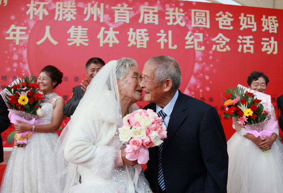 10月20日,86歲的柳西蓮老人為84歲的老伴胡方榮帶上戒指后獻上深情的吻。當天,由市文明辦、團市委、民政局主辦,市義工協會、棗莊中老年藝術協會、滕州愛心公益協會承辦的首屆“我圓爸媽婚紗夢”暨老年人集體婚禮紀念活動在市龍泉文化廣場舉行,來自全市的19對60歲以上的老年夫妻參加集體婚禮紀念活動,通過走紅地毯、子女獻花、敬茶禮等環節,喜圓老人穿婚紗舉行婚禮的溫馨夢想。滕州日報 記者:宋海存 編輯:劉偉