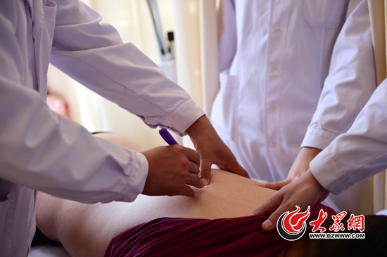 師彬?qū)λ鶐F隊的醫(yī)生進行講解,并用筆標記出針灸的穴位。大眾網(wǎng)記者 王長坤 馬俊驥 攝