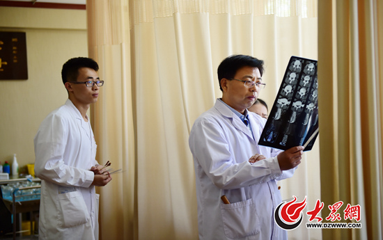 在濟南市經(jīng)十路18877號,有一所名為山東省醫(yī)學科學院頸肩腰腿痛醫(yī)院的中醫(yī)骨科醫(yī)院,這家醫(yī)院因不做手術就能神奇地解除頸椎、腰椎病痛為人們所熟知,每天都有許多全國各地慕名前來求醫(yī)的患者。4月15日,在該院二樓的中醫(yī)骨傷科門診室里,像往常一樣,該院院長師彬在患者和徒弟們十幾人的包圍中,聚精會神地看著患者陳蘭(化名)的脊椎影像片子。