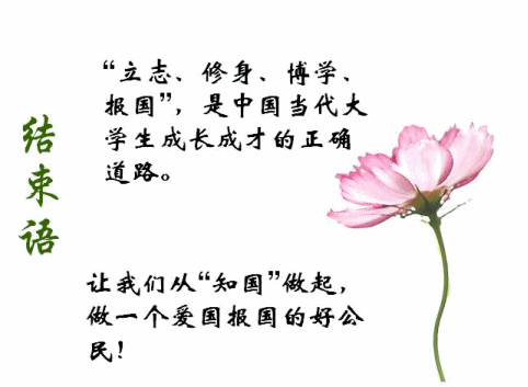 正確認識祖國的歷史和現(xiàn)實,增強愛國的情感和振興祖國的責任感,樹立民族自尊心與自信心;弘揚偉大的中華民族精神,高舉愛國主義旗幟,銳意進取,自強不息,艱苦奮斗,頑強拼搏,真正把愛國之志變成報國之行。今天為振興中華而勤奮學習,明天為創(chuàng)造祖國輝煌未來貢獻自己的力量!