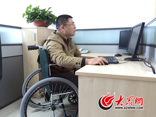 2015年11月2日,無腿青年吳洪飛第一天來到山東省人力資源社會(huì)保障信息中心上班,他也是2015年山東省直單位通過公開招考錄用的唯一一名重度殘疾人。