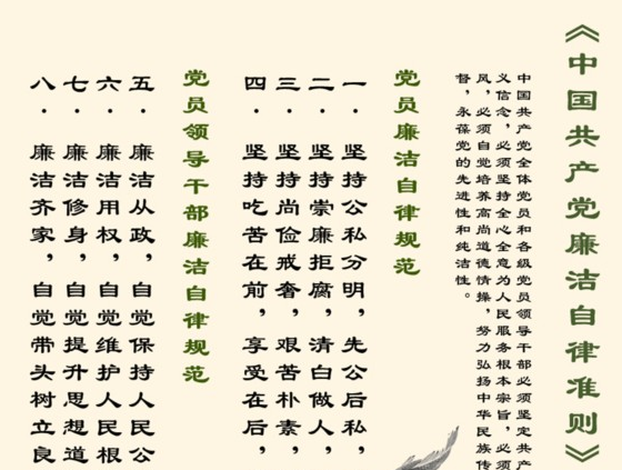 編者按:近日,中共中央印發了《中國共產黨廉潔自律準則》(以下簡稱《準則》),并發出通知,要求各地區各部門認真遵照執行!吨袊伯a黨廉潔自律準則》全文如下: 中國共產黨全體黨員和各級黨員領導干部必須堅定共產主義理想和中國特色社會主義信念,必須堅持... [詳細]