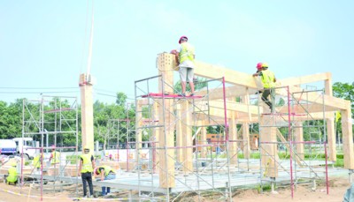德州新聞網(wǎng)訊(記者 王志冕)7月18日上午,來自北京建筑大學(xué)、香港大學(xué)的魯班柱和紫荊花聯(lián)隊為參賽作品斯陋宅上梁。“再有兩天,房屋主體就能完工了。 ”賽隊指導(dǎo)教師、北京建筑大學(xué)博士徐榮吉說。