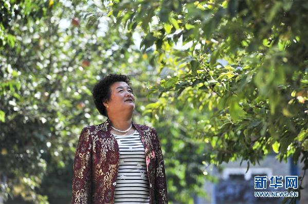 蓋買村村支書李元敏在查看村民庭院林果的長勢(shì)(9月14日攝)。 新華社記者 胡虎虎 攝