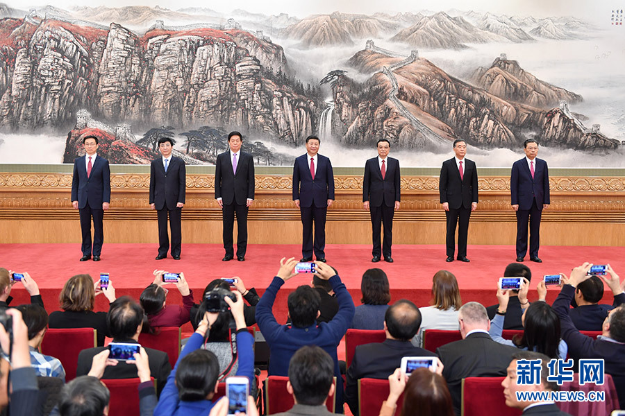 10月25日,黨的十九屆中央委員會第一次全體會議新選出的中央政治局常委同中外記者見面。新華社記者 李濤 攝