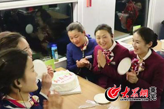 大眾網萊蕪2月14日訊(記者 亓秀寶)張超冉,是一名普通的列車員,她擔當列車員已有三年,猴年除夕她正在飛速的列車上值班,而這一天恰巧也是她的生日。不能回家陪家人過年,也不能和家人一同度過生日,但是在這一天,張超冉得到了意外的生日禮物,整個高鐵車廂一路幸福滿載。