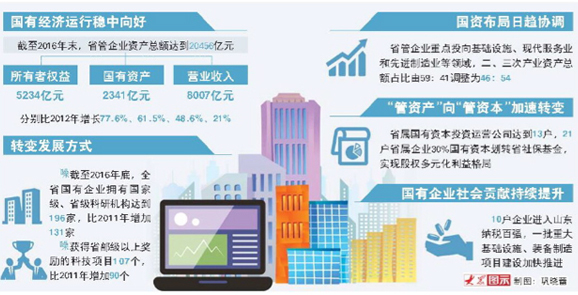 在山東,國企改革是事關發展全局的大文章。上世紀90年代領國有中小企業改革風氣之先的山東,在新一輪國企改革中再次“勇于擔當”:組建國有資本投資運營公司、完善公司治理結構、經營性國有資產統一監管……一系列精準化改革推動山東國有資本布局結構加速優化調整。截至2016年末,省管企業資產總額達到20456億元,所有者權益5234億元,國有資產2341億元,營業收入8007億元,分別比2012年增長77.6%、61.5%、48.6%、21%。