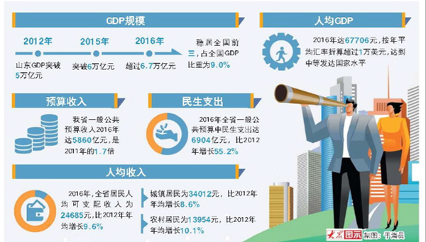 如同邁上“開往春天的地鐵”,山東的經濟文化強省建設櫛風沐雨、平穩前行,駛過不平凡的五年:2012年,山東GDP突破5萬億元;2015年突破6萬億元;去年超過6.7萬億元,穩居全國前三,占全國GDP的比重為9.0%。
