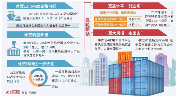 數(shù)據(jù)顯示:2016年,30家外貿(mào)綜合服務(wù)企業(yè)出口209.1億元,增長1.6倍,拉動全省出口增長1.4個百分點(diǎn);跨境電子商務(wù)出口477.6億元,增長45.3%,拉動全省出口增長1.7個百分點(diǎn);對“一帶一路”沿線新興經(jīng)濟(jì)體出口呈現(xiàn)快速增長勢頭。